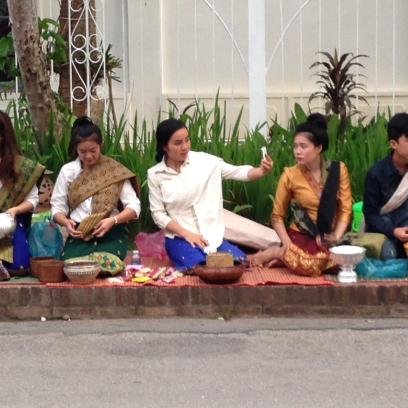 Dawn in Luang Prabang, Northern Laos. As they have for centuries, Buddhist monks wearing saffron robes and carrying alms dishes emerge from the many wats that line the streets of this one time capital city and process down its main streets in a single, silent line. Hundreds of locals, mostly women, take their places seated along the sidewalks, their arms filled with baskets of sticky rice wrapped in banana leafs and bags of candy and food. As the procession of monks heads towards them, they maneuver themselves into place, organize their alms, prepare for this most spiritual of Buddhist encounters, and… take a few selfies.