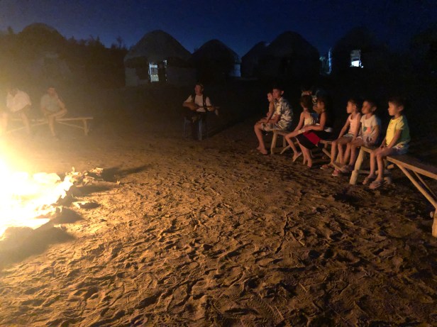 We passed the afternoon reading, chatting, dripping sweat, and sipping beer. Attempts at taking photos were stymied by iPhones refusing to operate in the heat. By nightfall, the temperatures had cooled and dinner was served. There were rumors circulating of a Kazak musical performance for the evening, so when a man in traditional Kazak clothing walked through the dinner area, picked up a blue plastic chair and headed for the fIrepit, a small gaggle of guests quickly followed him. After starting the fire and playing a few songs, he gestured to the 10 of us around him in a way that could easily have been translated as “dance, monkey, dance.” When an old Kazak man with a dombra tells you to dance, you dance. Being unskilled in the art of Central Asian Dance (or any dance for that matter), I followed the lead of the Uzbeks in the crowd. Their efforts reminded me of a cross between group dances I had done at Greek weddings and birds taking flight, and weren’t difficult to join in on. So there, under a star-filled sky in the middle of the Kyzylkum desert, we danced. And, while no one took flight, the dancing helped lift our spirits from the slow drain of the day.