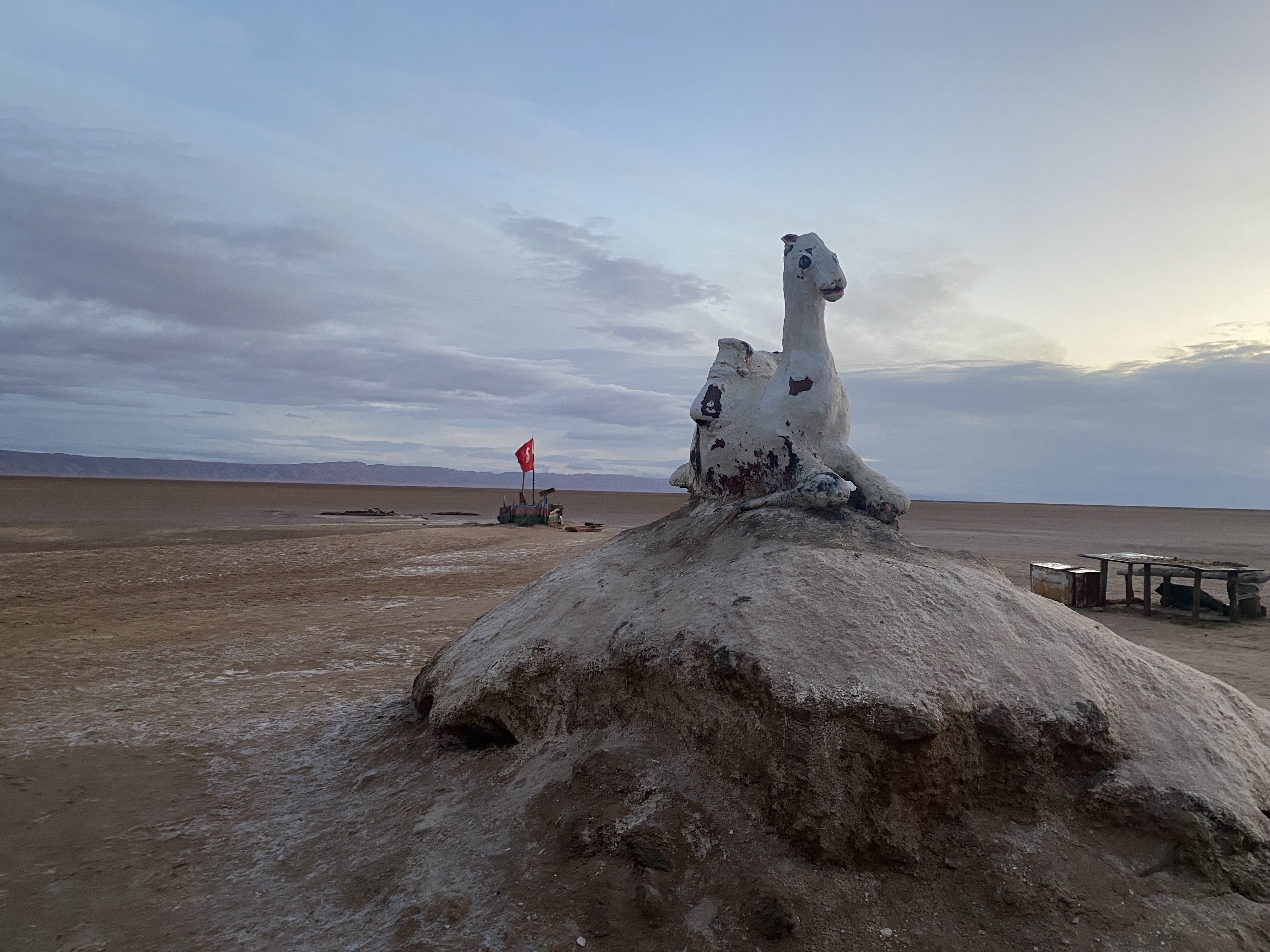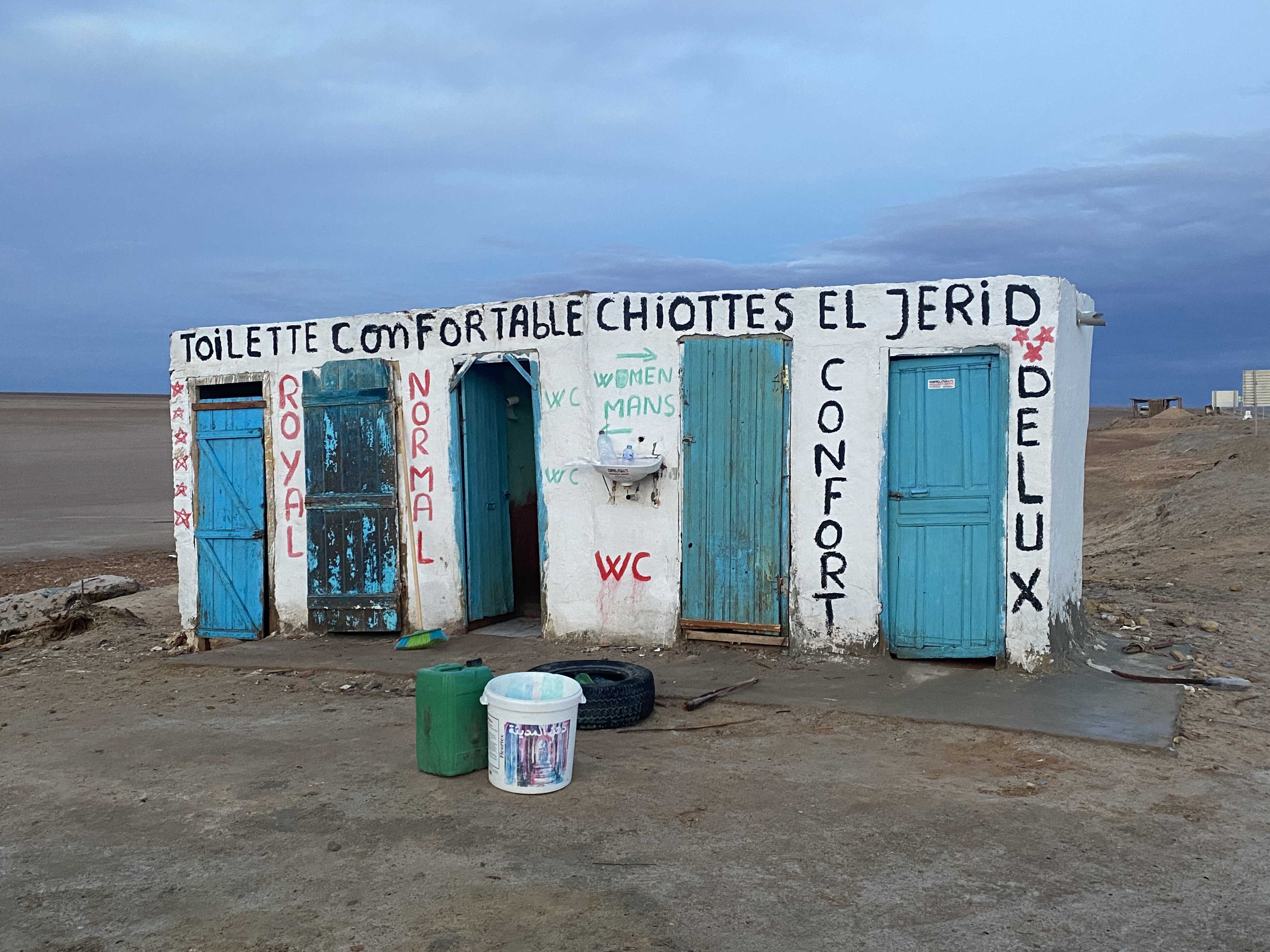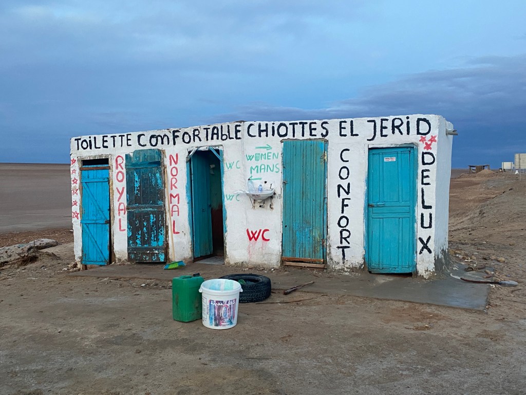 A visit to the Homestead was too far out of the way for our day, but we did make a stop to watch the sun (only one!) rise over the mountains at the edge of the expansive salt lake. That stop included the opportunity to buy Saharan Rock salt, wander onto the Chott, and use the only bathroom available along the cross-Chott el Djerid road. It involved some serious decision-making, for sure (see below).